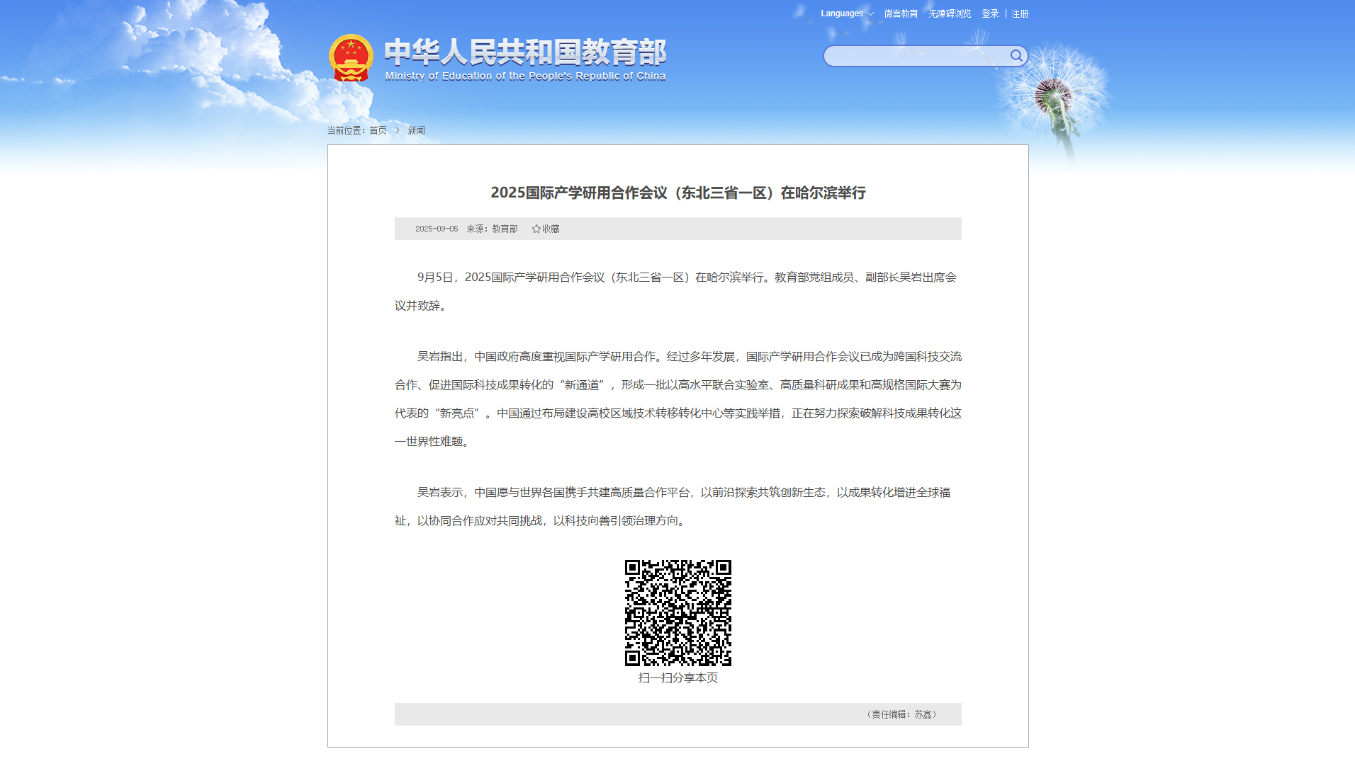 9月5日,2025国际产学研用合作会议(东北三省一区)在哈尔滨举行,教育部党组成员、副部长吴岩出席并致辞。